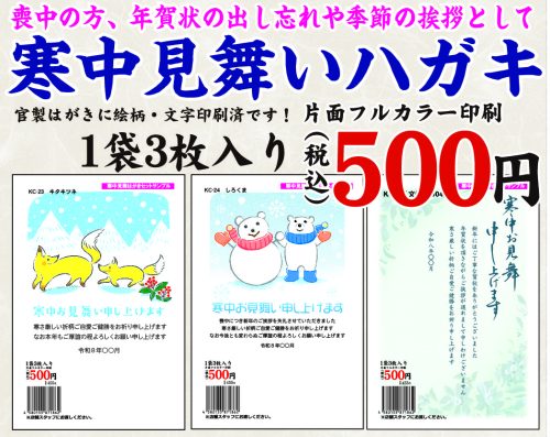 お手軽寒中見舞いはがき1セット3枚500円(税込)にて店頭販売中!